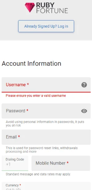 - Next, select your country and province of residence, then create a username and password for your Ruby Fortune account.