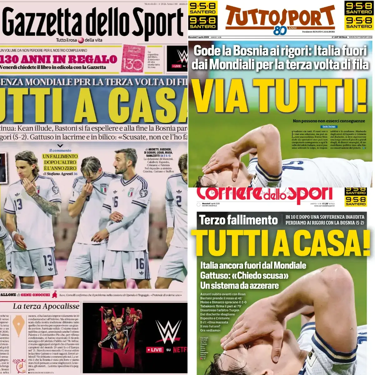 Другите медии не остават по-назад: „Corriere della Sera“ има няколко опустошителни анализа – „Това е пълен кошмар, но Гатузо заслужава благодарност: той няма нищо общо с това. В една нормална държава Гравина щеше да подаде оставка“, „Апокалипсисът на Италия – отменено е Световното за трети път“, както и много, много подтиквания към „незабавна промяна“ и „национална революция“ във футбола в страната.